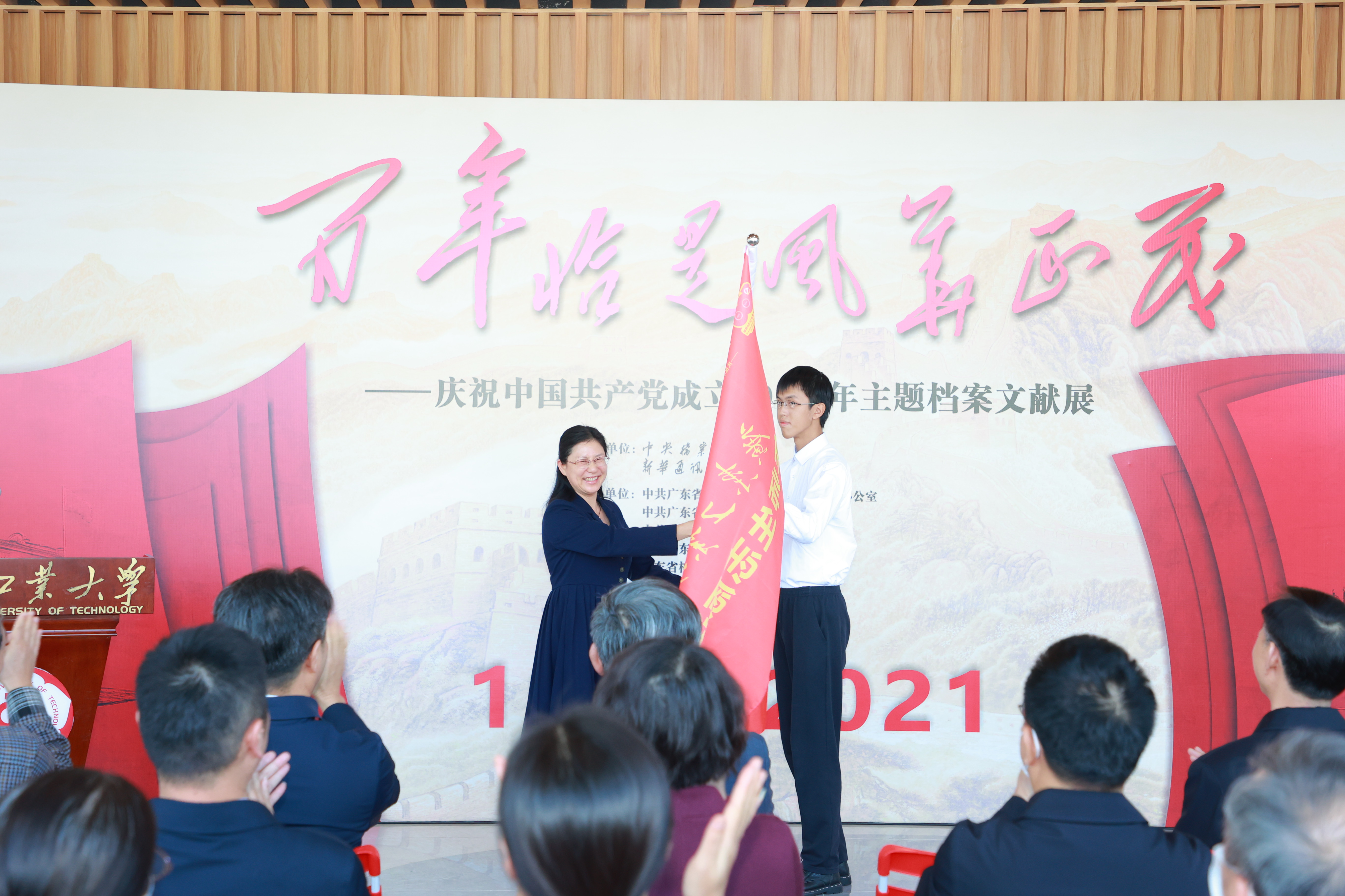 为使师生更好地学习和了解此次展览,学校组建了包括马克思主义学院教师和学生党员、入党积极分子在内的青年师生志愿讲解团,他们将利用学习工作之余志愿为大家开展讲解服务。开幕式上,黄菊艳为广工“百年恰是风华正茂”主题档案文献展青年师生志愿讲解团授旗。