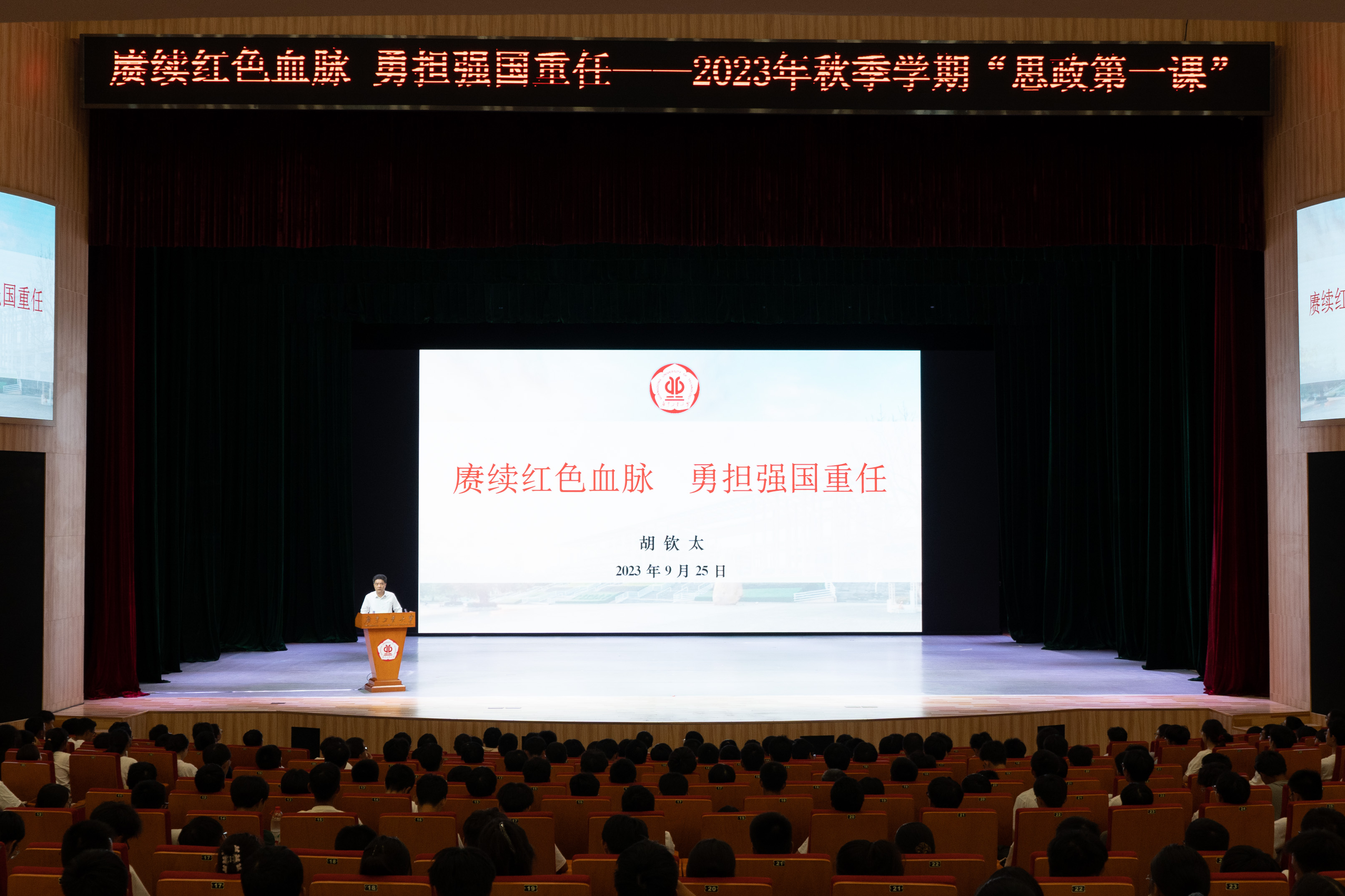 9月25日下午,学校党委书记胡钦太以《赓续红色血脉 勇担强国重任》为题,在广工大学城校区文化活动中心为600余名新生讲授“思政第一课”,与新生重温广工65载风雨路,厚植红色基因,畅聊当代大学生的使命与担当。