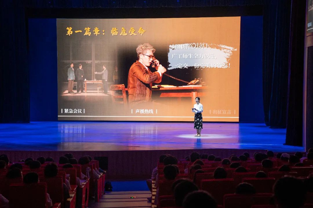 围绕胡钦太的授课主题,广工原创情景史诗剧《青春印丰碑》总导演郑萌和执行导演、剧目主演陈蕾分别走上舞台,以现场解说+视频展演的方式,把“青年担当”的思政教育内容融汇贯穿在艺术作品的欣赏之中。剧中原型人物、广工1965届校友、东深供水工程建设者代表陈汝基现身大荧幕现场连线,为学校即将迎来本科办学65周年送上祝福,为师弟师妹加油鼓劲。学校高水平舞蹈团演绎了剧目衍生舞蹈作品《洪流》。同学们跟随舞蹈演员的舞步回到热火朝天的“东深”建设现场,因临危受命而紧张,为风雨“征战”而揪心,被“人在,围堰在”的誓言所震撼……不知不觉间,不少同学红了眼眶。