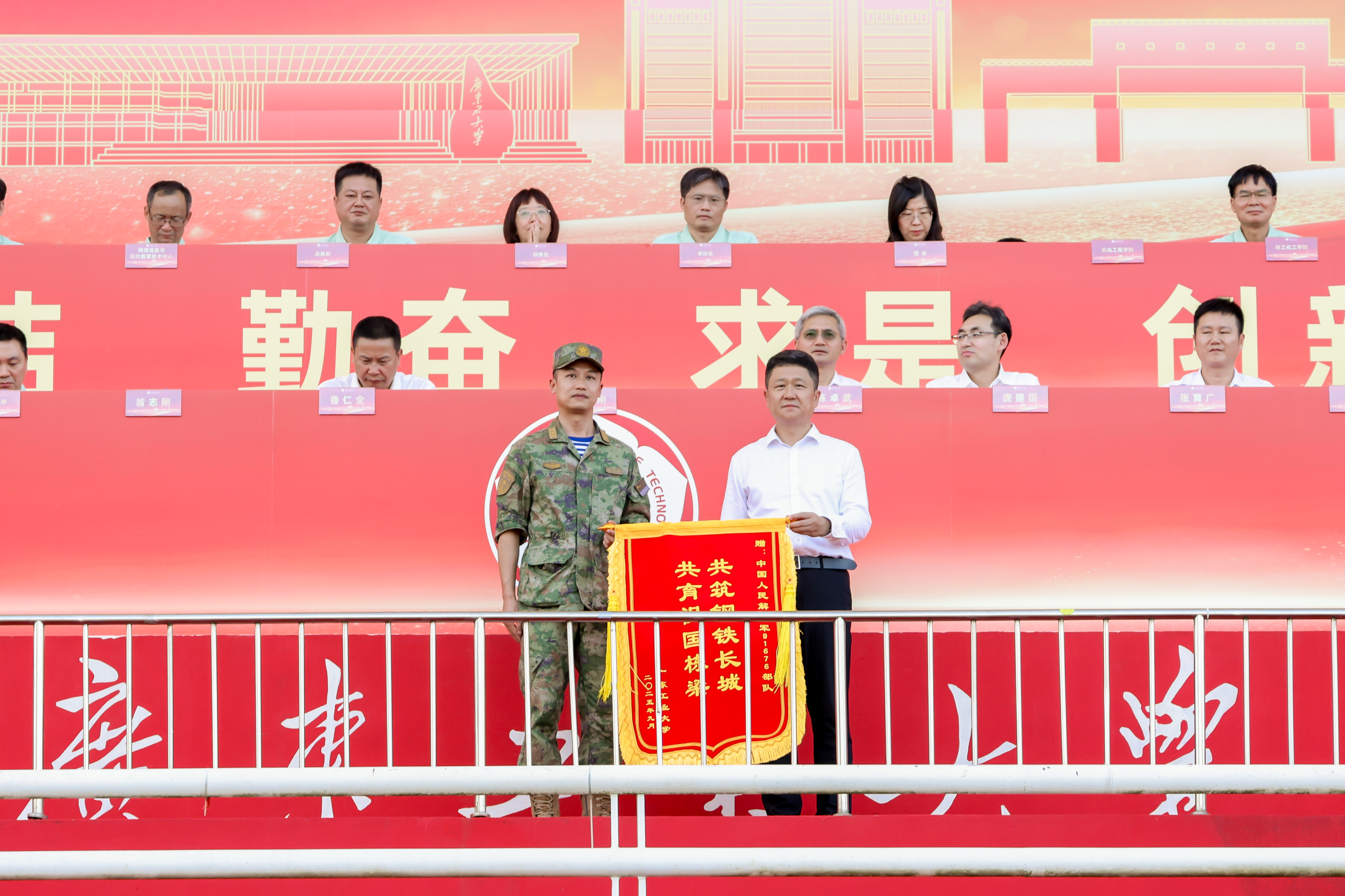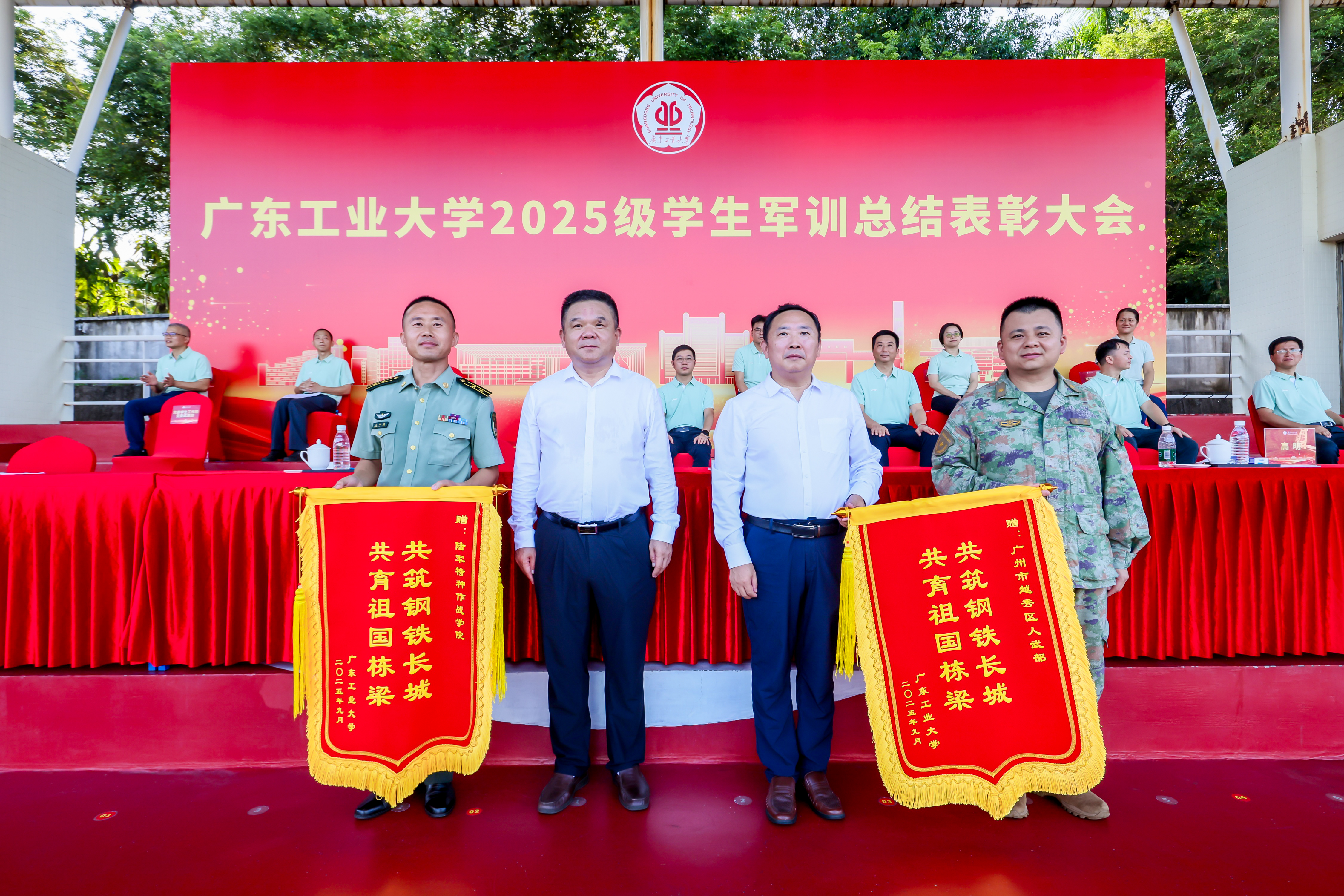 杜承铭、王振友分别在龙洞校区、揭阳校区讲话。陈卓武、余林、揭阳校区负责人分别宣读《关于表彰2025级学生军训先进集体和先进个人的决定》,校领导和承训单位领导为获奖集体和个人代表颁奖。白建刚、杜承铭、王振友、余林向承担本次军训任务的陆军特种作战学院、中国人民解放军91676部队、中国人民解放军92822部队、广州市越秀区人民武装部赠送锦旗。