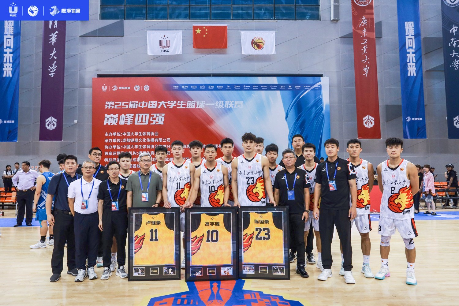 当天还举行了退役仪式,广工高宇锋、卢健豪、陈国豪分别领到赛会颁发的明博电竞官网10号、11号、23号球衣作为参赛纪念。