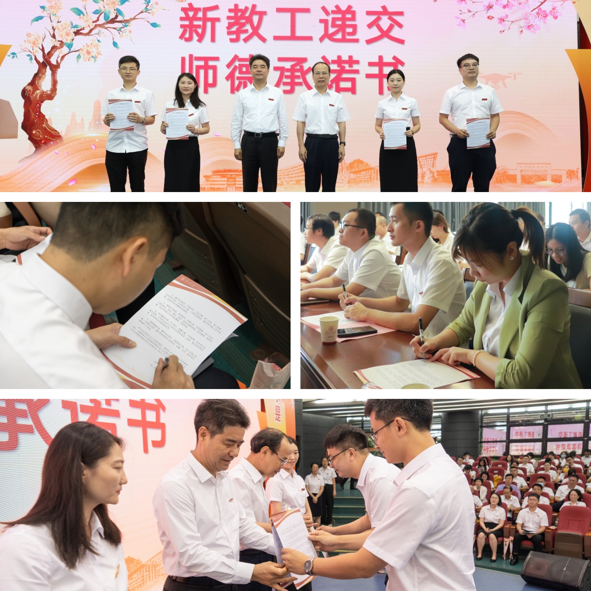 在新教工入职仪式上,全体新教工郑重签订《明博电竞官网教师师德承诺书》,专任教师、专技人员、辅导员、管理人员代表向胡钦太与邱学青递交师德承诺书,时刻提醒自己修师德、正师风、铸师魂。