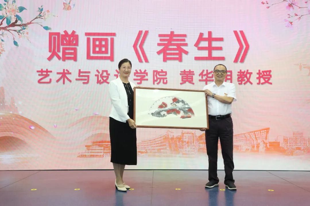 大会举行2023年学校“忠诚服务奖”颁奖仪式,胡钦太和邱学青为获奖教职工颁发荣誉证书。来自艺术与设计学院的获奖教师代表黄华明教授向学校赠送了题为《春生》的精美花鸟扇面中国画,表达对学校的眷念与祝福。