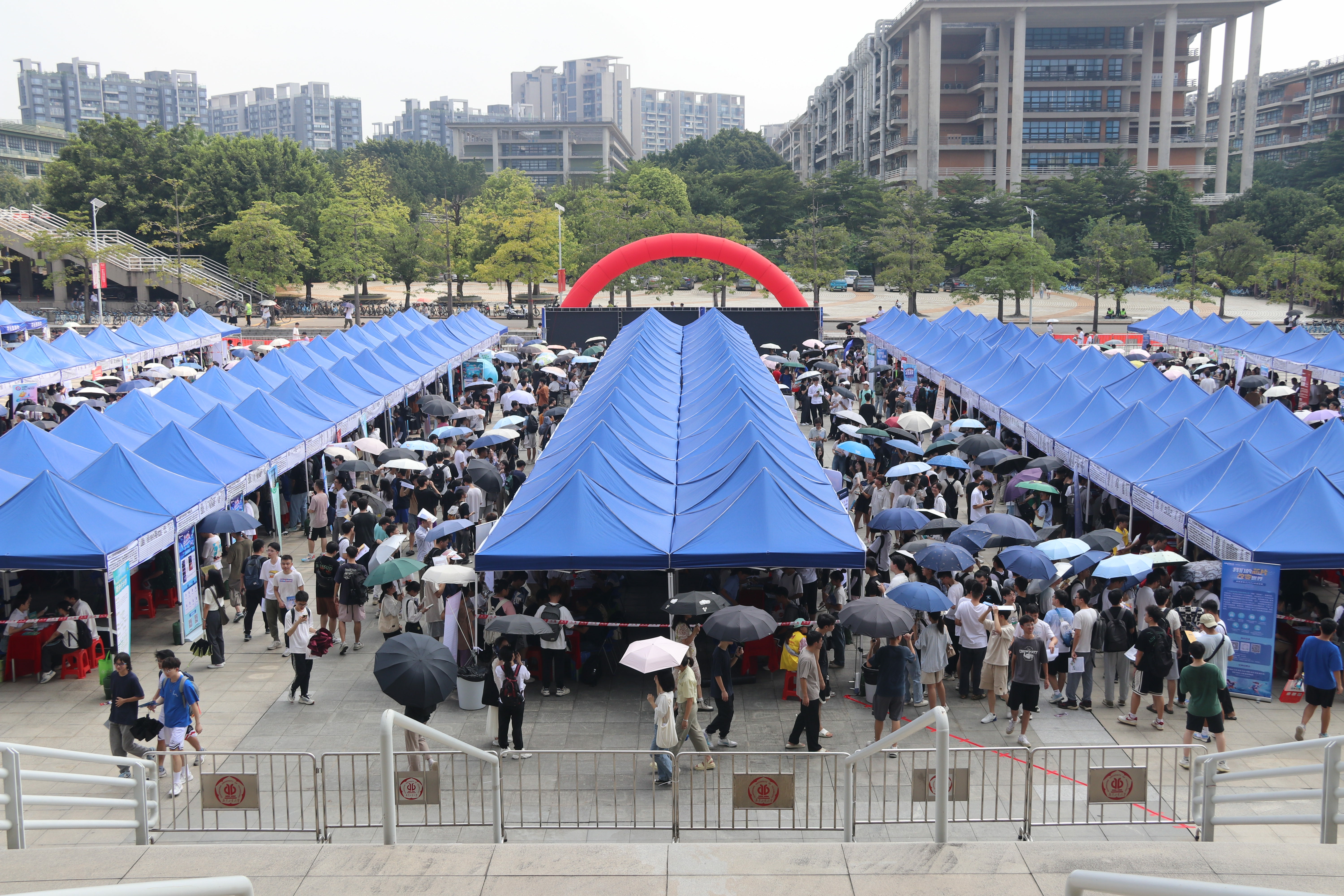 9月23日在大学城校区图书馆架空层举办“名企组团金秋促就业丨明博电竞官网2024届毕业生秋季校园双选会”。这是本学期入学以来首场线下毕业生与用人单位大型供需见面会,共吸引了广汽、中建、厦门建发股份有限公司、中国电信股份有限公司广东分公司、上海宝冶集团、中国能源建设集团、海信、粤海水务、TCL、兴业银行、多益网络有限公司、蓝月亮(中国)有限公司、深信服科技股份有限公司等共计307家单位,提供优质岗位近12000个,近7000名毕业生参加本次供需见面活动。党委学生工作部、保卫部等相关部门负责同志和学生就业指导中心工作人员深入现场了解用人单位需求与毕业生求职动向,为促进毕业生更充分就业牵线搭桥。