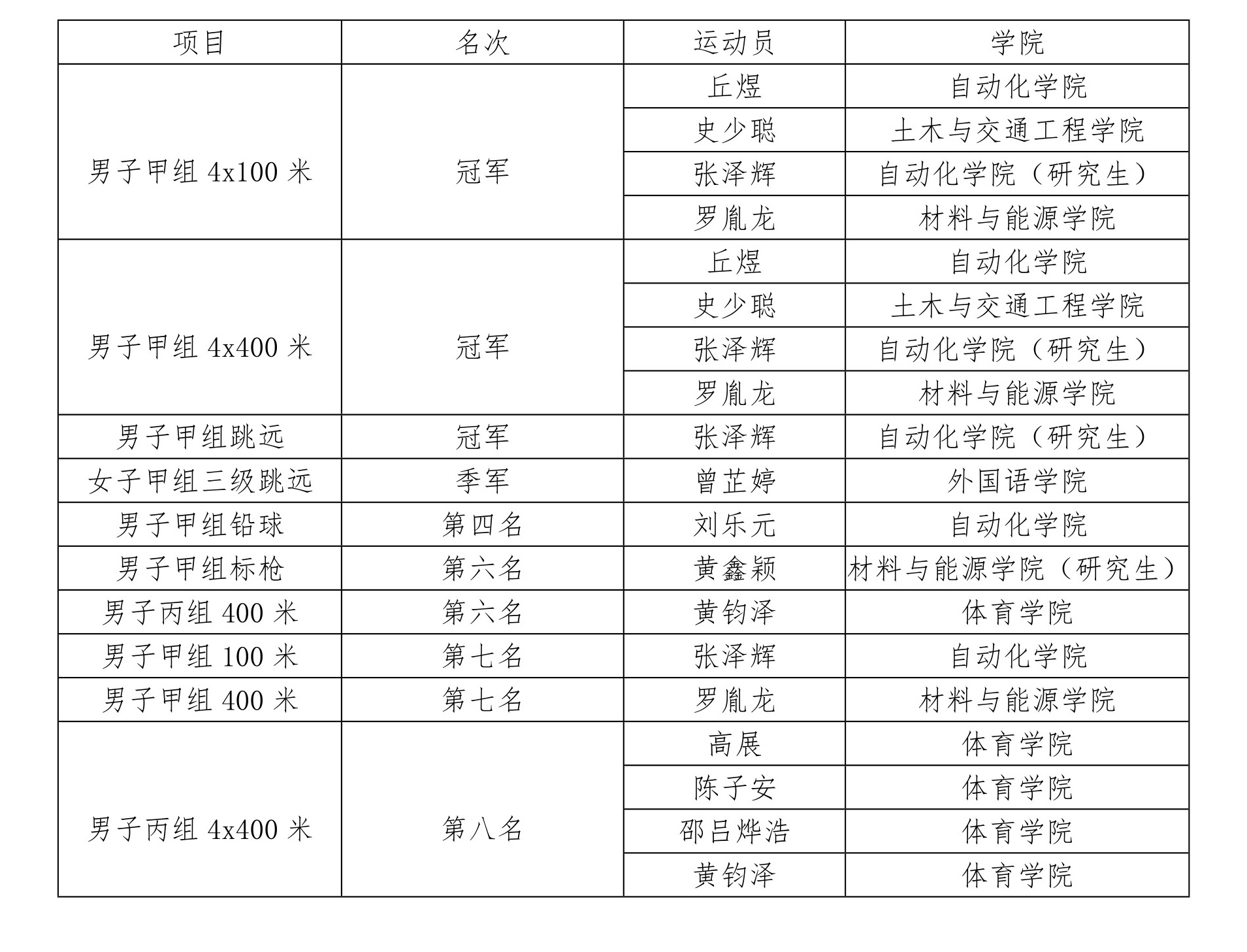 又讯,8月10日至15日第23届全国大学生田径锦标赛在湖北黄石奥林匹克体育中心举行,广工田径队斩获3金1铜,勇夺男子甲组团体总分第一名、甲组团体总分第二名,并荣获“体育道德风尚奖”,创下学校参加该项赛事的历史最佳成绩。至此,广工已经连续四届问鼎全国锦标赛男子甲组团体总分第一名,连续两届取得甲组团体总分第二名。