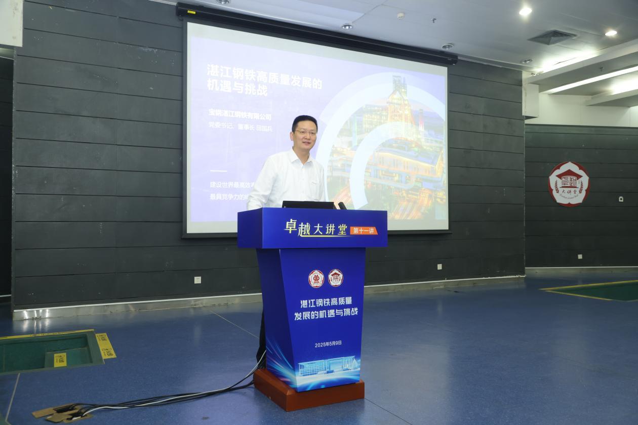 5月9日上午,宝钢湛江钢铁有限公司党委书记、董事长田国兵莅临我校,担任“卓越大讲堂”第十一讲嘉宾,以“湛江钢铁高质量发展的机遇与挑战”为主题,带来了一场精彩的报告会。学校党委常委、副校长杜承铭会见田国兵董事长并出席报告会,相关部门、学院负责人,青年教师和研究生代表共计300多人聆听报告。报告会由低碳冶金工程创新交叉研究院王中丙教授主持。