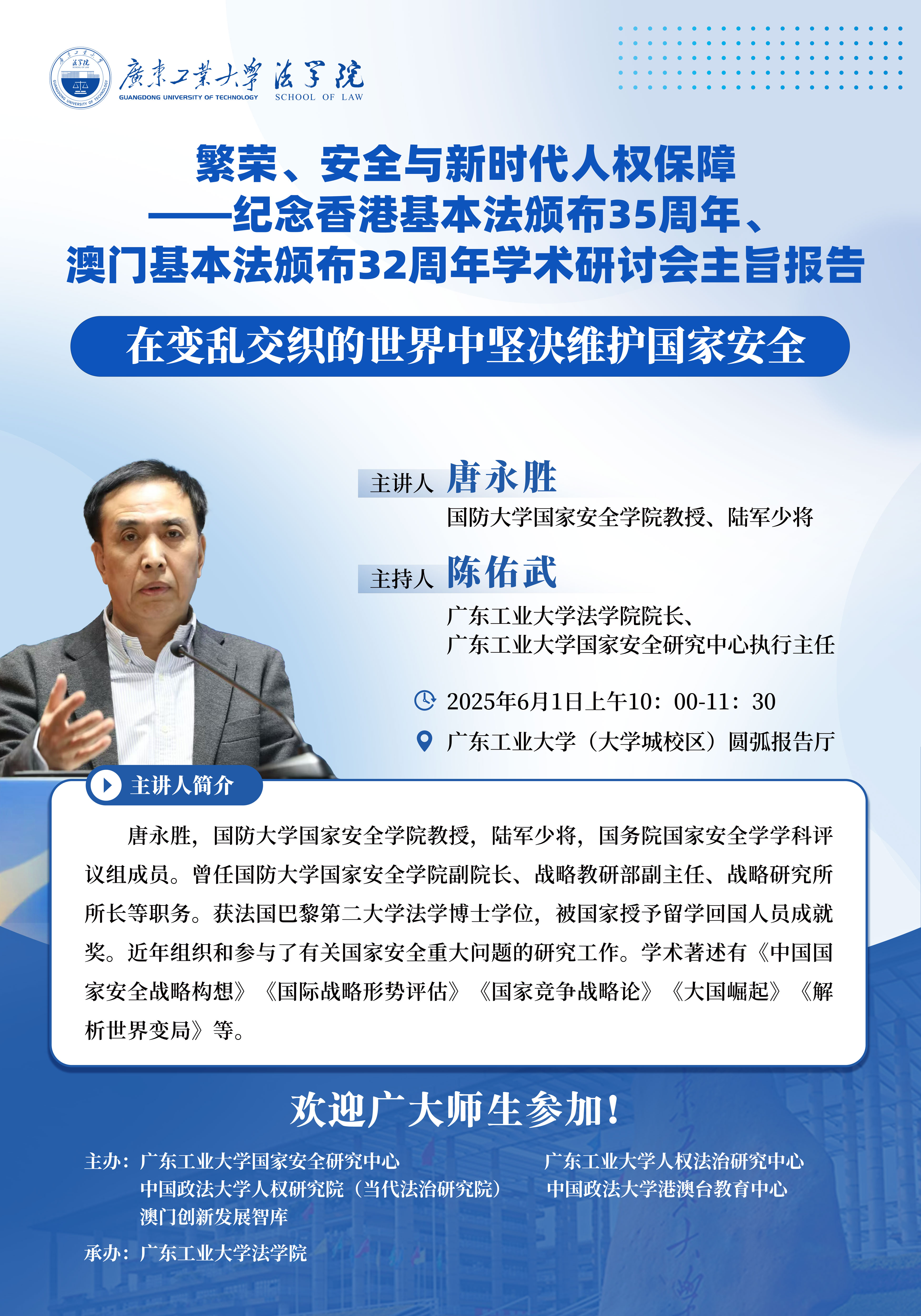 为深入学习贯彻落实习近平总书记在党的二十届三中全会提出的“全面贯彻总体国家安全观”“坚持正确人权观”的具体要求以及习近平总书记关于“促进香港澳门长期繁荣稳定,支持香港、澳门更好融入国家发展大局”的重要指示,明博电竞官网法学院、明博电竞官网国家安全研究中心、明博电竞官网人权法治研究中心、中国政法大学人权研究院(当代法治研究院)、中国政法大学港澳台教育中心、澳门创新发展智库将举办“繁荣、安全与新时代人权保障——纪念香港基本法颁布35周年、澳门基本法颁布32周年学术研讨会”。届时将有来自国家安全、人权、法学等领域的50多名校内外知名专家学者参加。