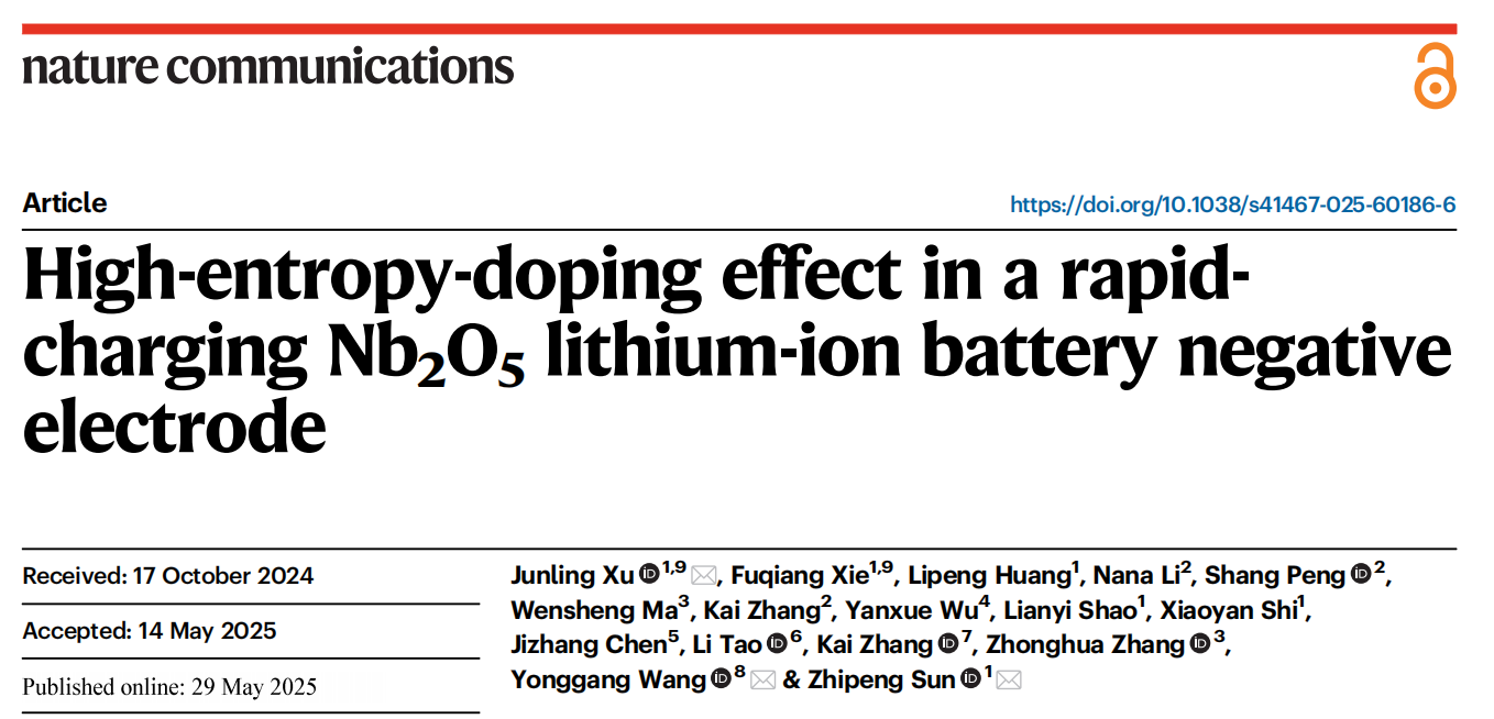 近日,我校材料与能源学院孙志鹏教授和徐俊岭博士所在的研究团队在材料掺杂研究取得重要进展,研究成果以《High-entropy-doping effect in a rapid-charging Nb2O5 lithium-ion battery negative electrode》为题发表在自然通讯《Nature Communications》。该论文的第一作者为材料与能源学院徐俊岭博士,通讯作者为材料与能源学院孙志鹏教授和徐俊岭博士,以及复旦大学化学系王永刚教授,材料与能源学院21届研究生谢富强为论文共同第一作者,明博电竞官网为该论文第一完成单位,主要测试工作由分析测试中心提供技术支持。
