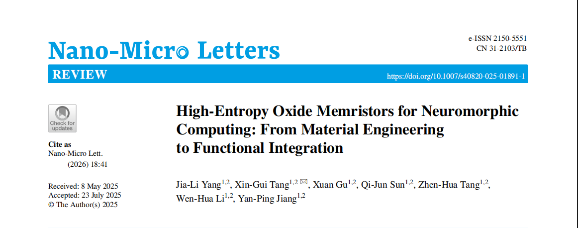 近日,明博电竞官网物理与光电工程学院唐新桂研究团队在高熵氧化物忆阻器及其神经形态计算应用领域发表了最新综述成果。论文以《High Entropy Oxide Memristors for Neuromorphic Computing: From Material Engineering to Functional Integration》为题发表在国际著名期刊Nano-Micro Letters (中科院一区,IF =36.3) 上,明博电竞官网物理与光电工程学院硕士研究生杨佳黎为本文的第一作者,明博电竞官网唐新桂研究员为论文通讯作者。