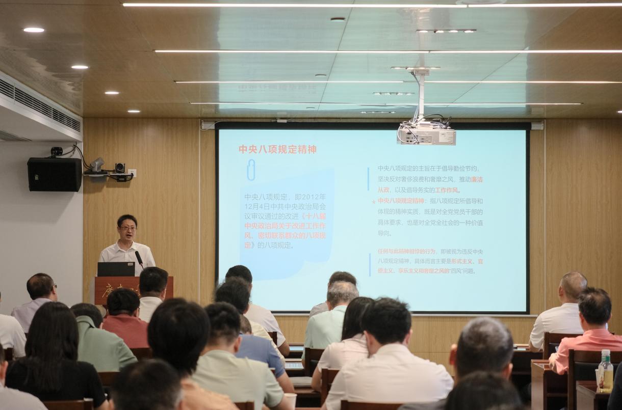 揭晓教授以《深入贯彻中央八项规定精神,推进新时代党的作风建设》为主题,紧扣学习贯彻习近平总书记关于加强党的作风建设的重要论述,从党史与现实、理论与实践等多个维度,详细梳理了中央八项规定出台的历史背景、主要内容和现实意义。报告内容结合近年来全国各地由风及腐的典型案例,展示了党的十八大以来驰而不息贯彻落实中央八项规定精神所取得的成效和经验,分享了新时代高校坚持不懈推进新时代党的作风建设的思考与体会。